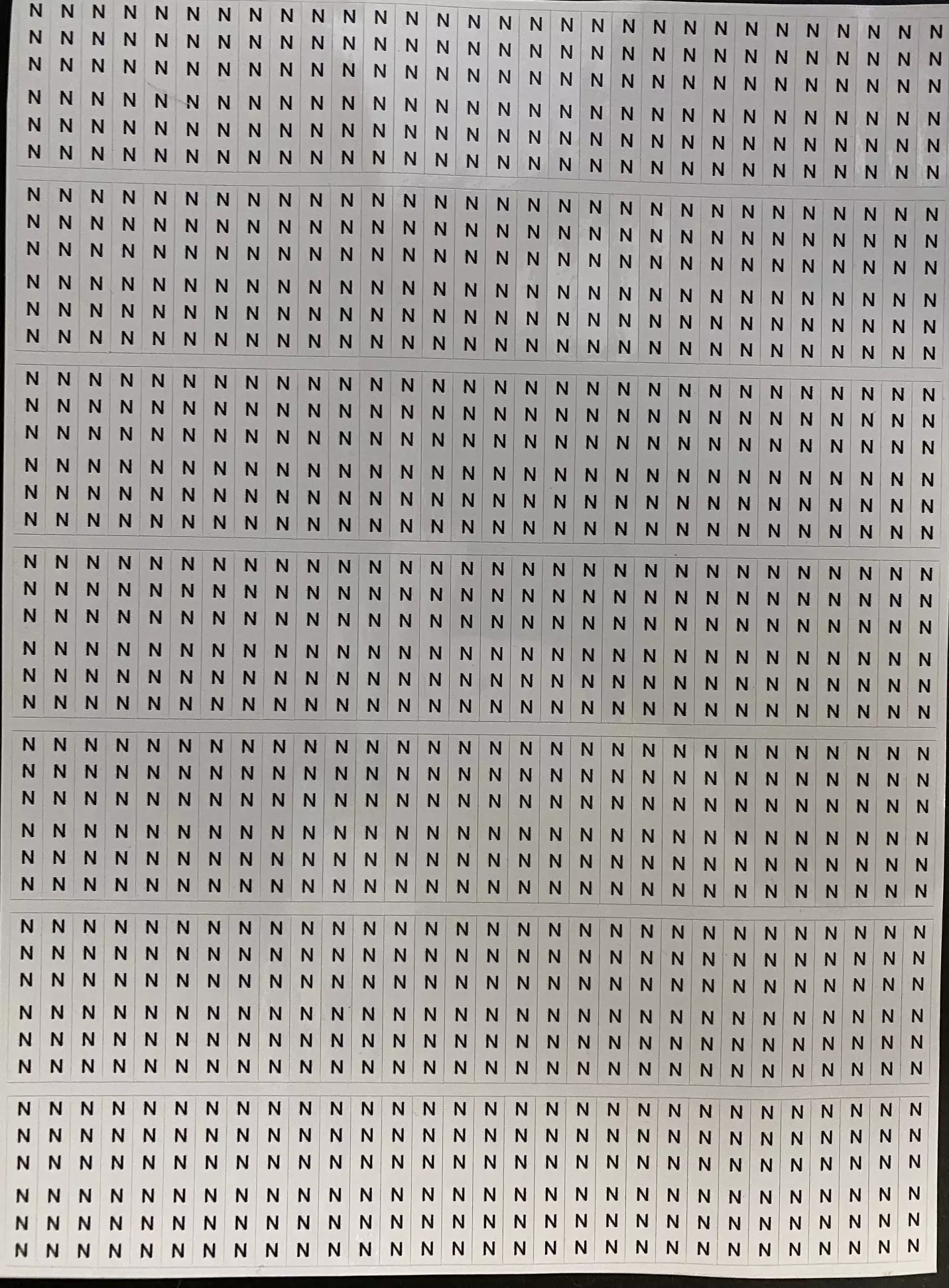 Johdinmerkkaus tarra musta N valkoisella pohjalla, tarrat tulevat arkkina jossa N-tarroja on 210kpl, yhden tarran koko 6x38mm