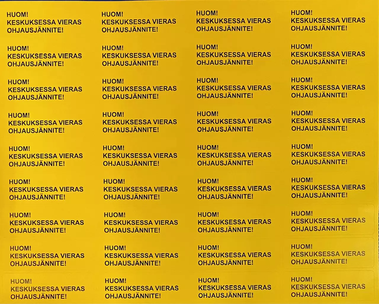 Tarra => HUOM! KESKUKSESSA VIERAS OHJAUSJÄNNITE! keltainen tarra jossa musta painatus 20x60mm arkilla 36kpl
